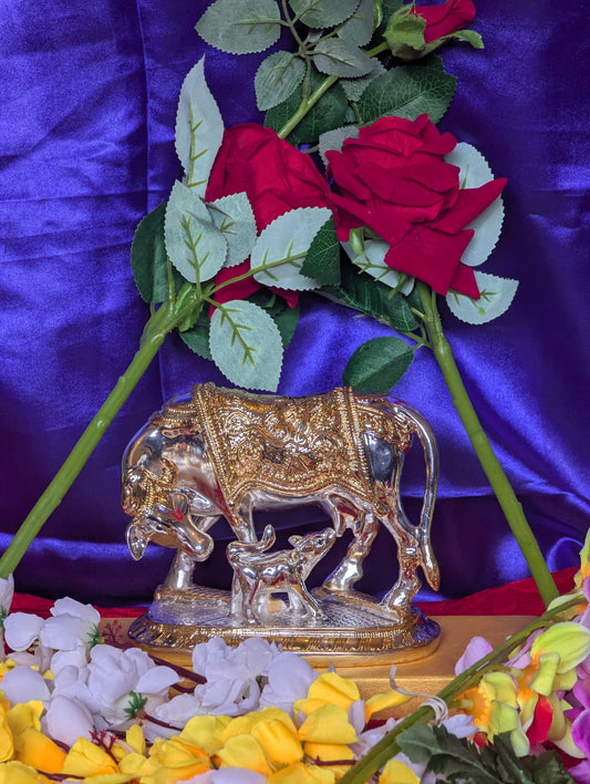 Kamdhenu Cow with Calf Idol - Gold & Silver Plated