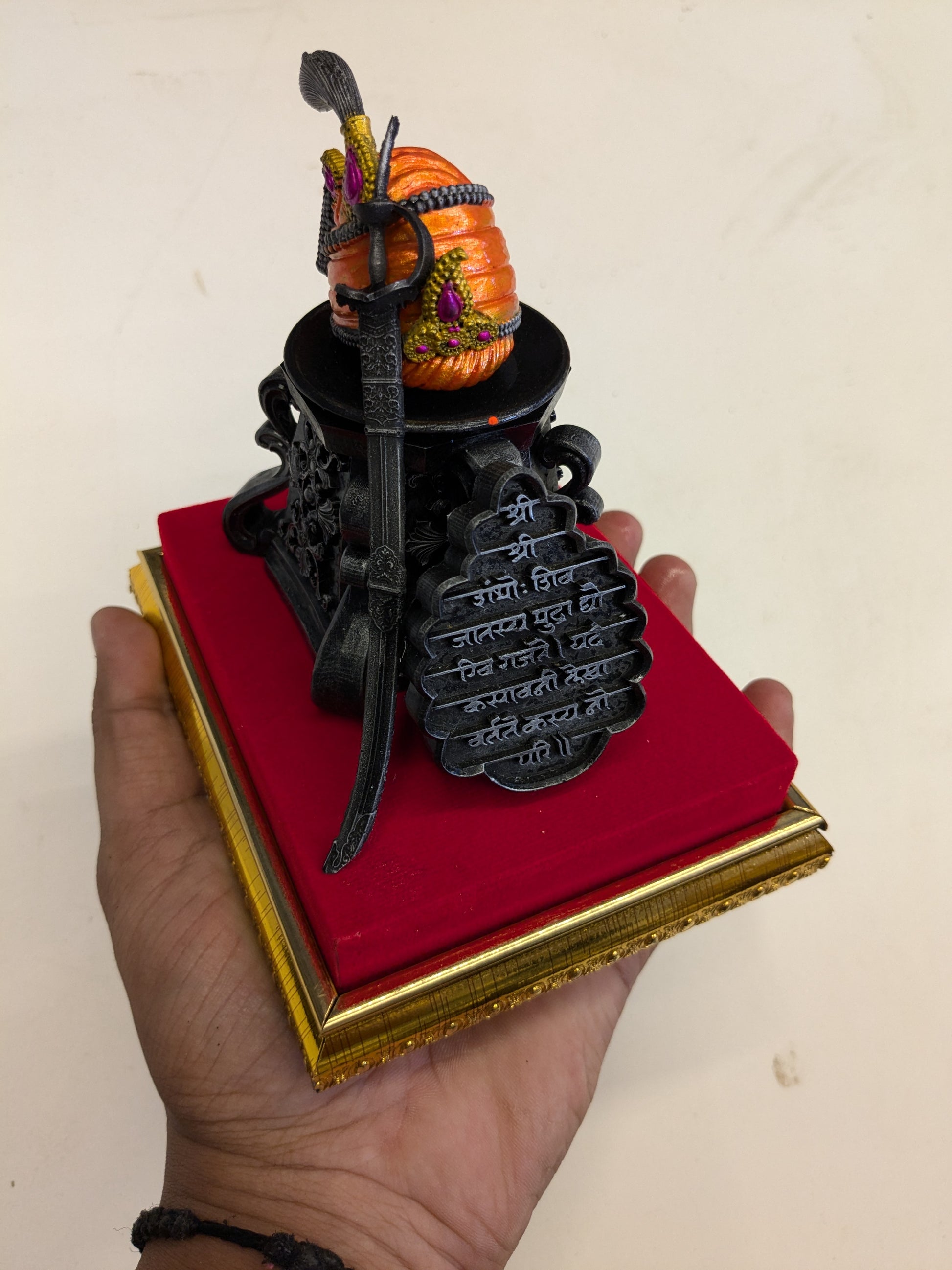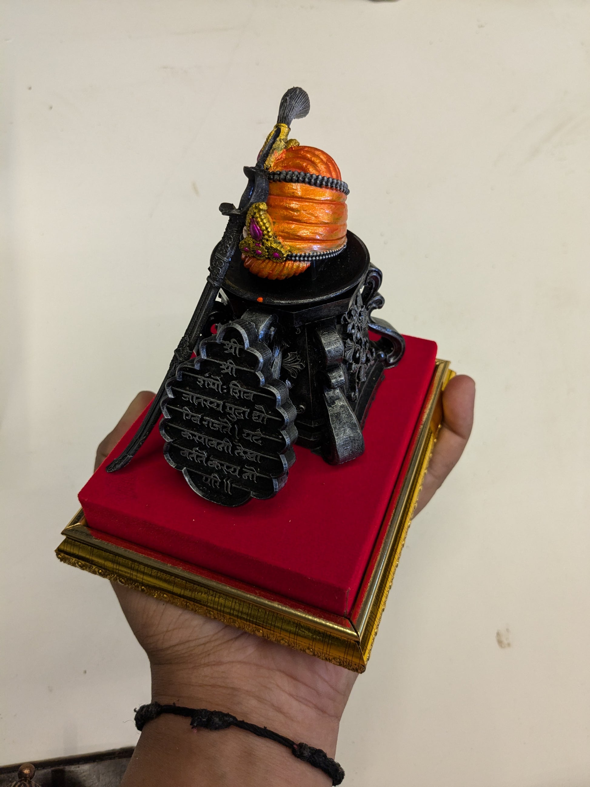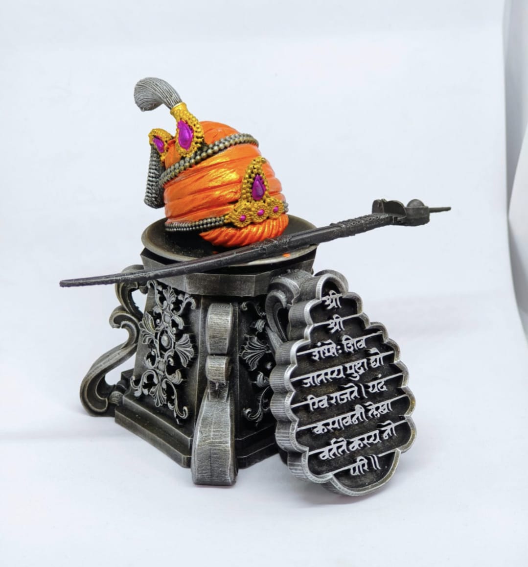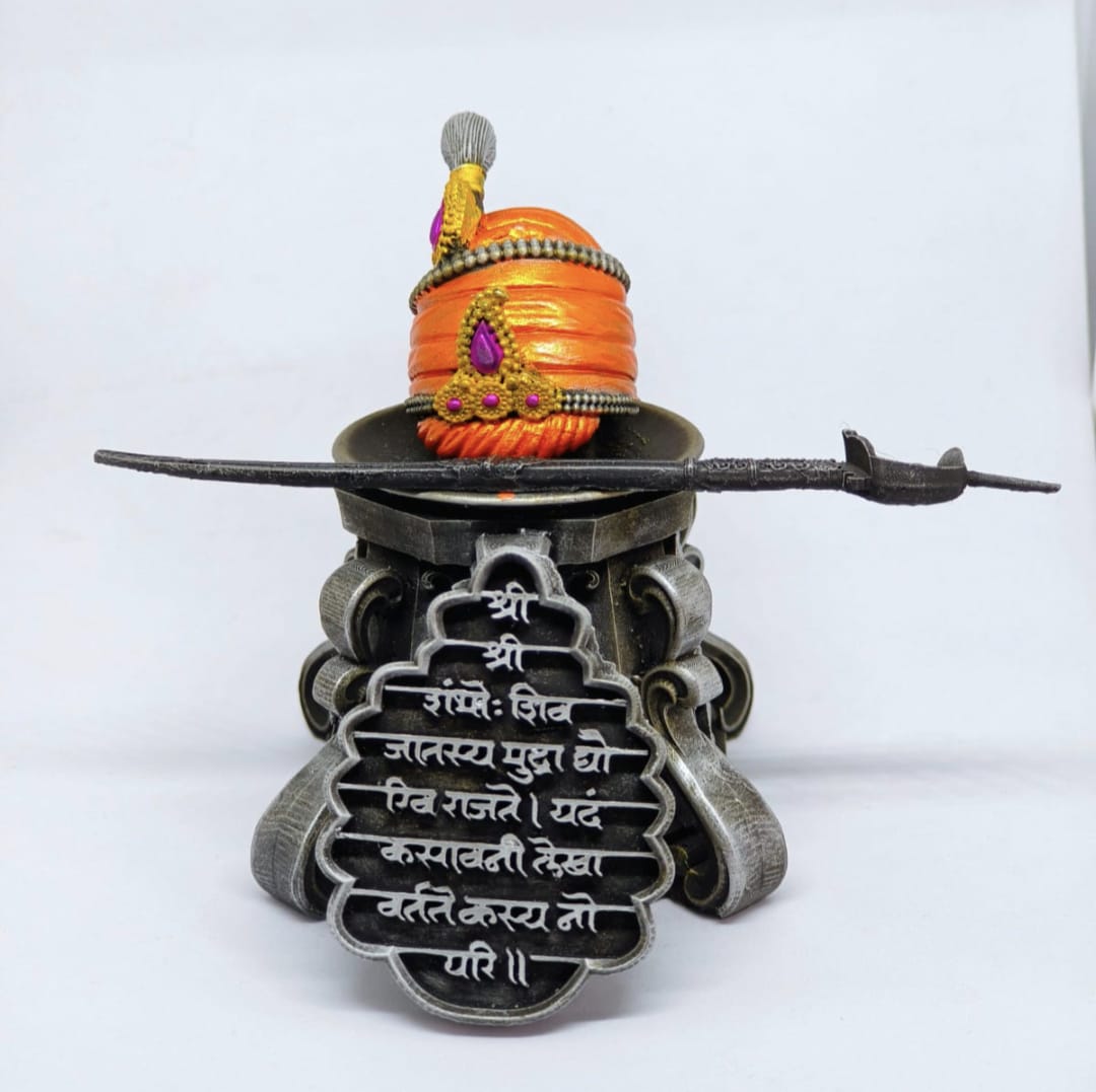 Celebrate the glory of the Maratha Empire with this exquisite idol featuring the Rajmudra, Talwar (Sword), and the iconic Maratha Pheta (Turban) of Chhatrapati Sambhaji Maharaj. This unique design symbolizes royalty, bravery, and heritage, making it a powerful piece of devotion and pride.