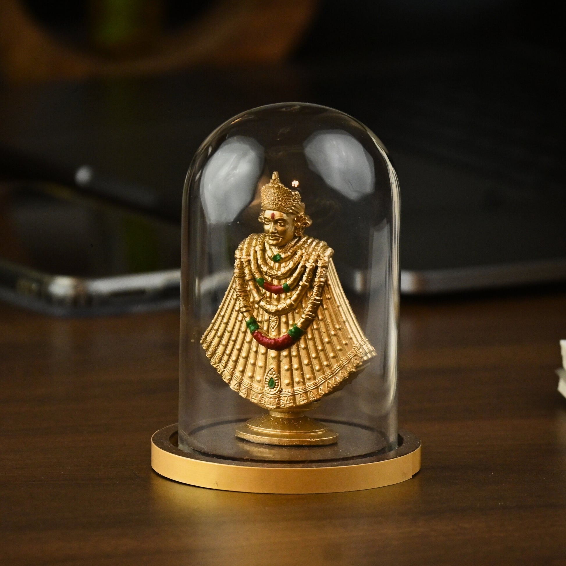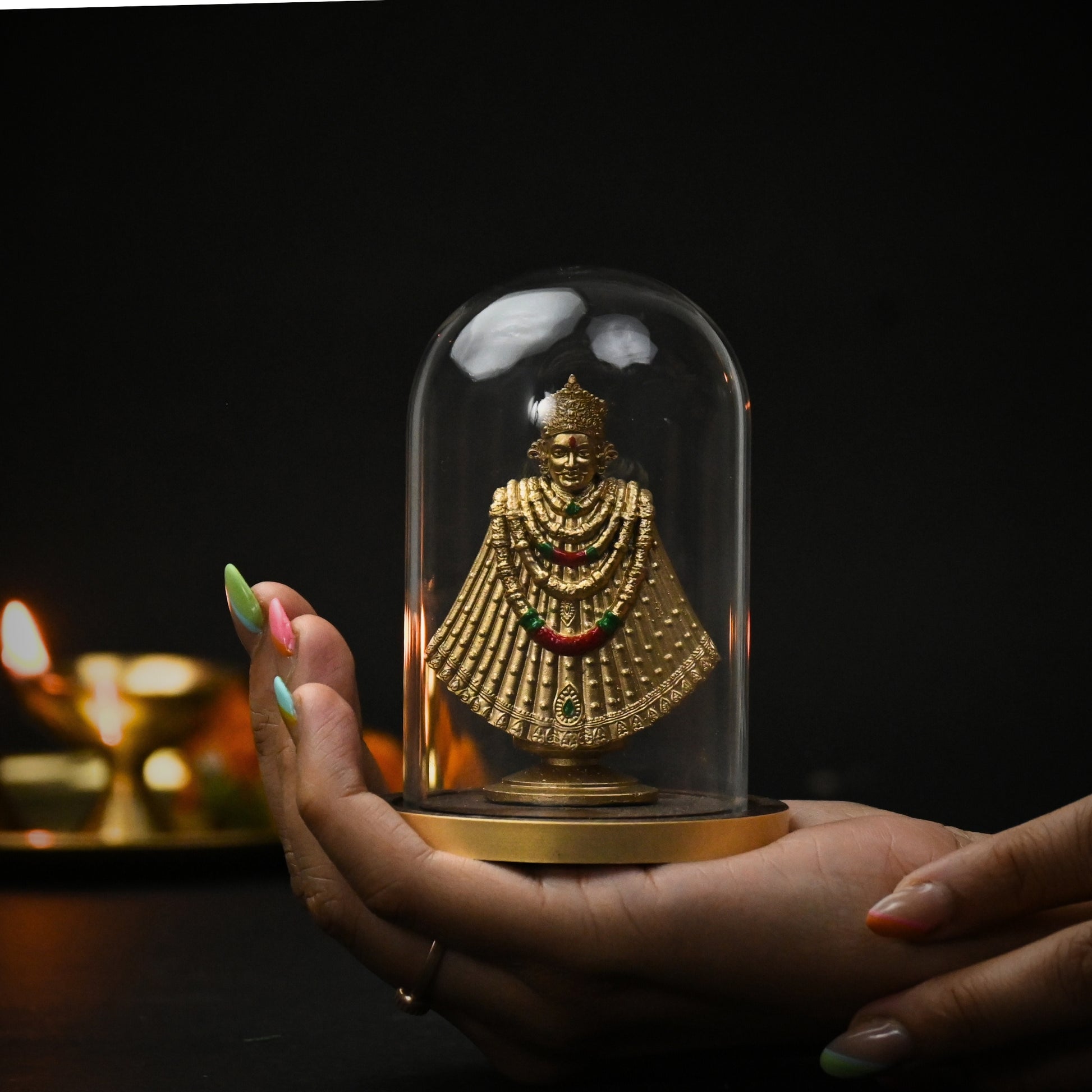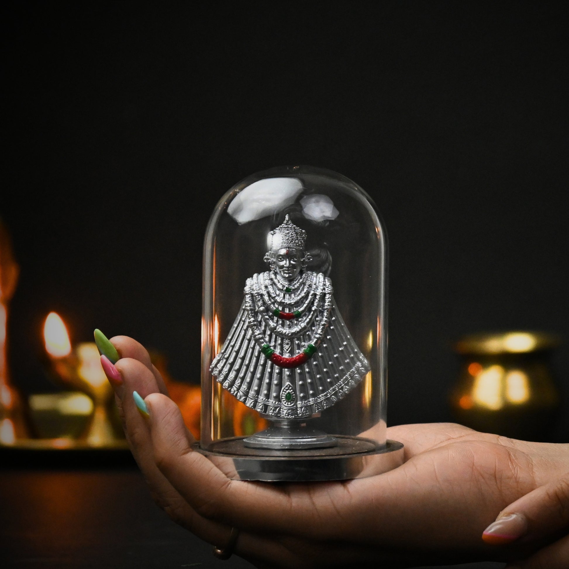 Encased in a crystal-clear borosilicate glass dome, this divine idol radiates positivity, strength, and grace, while staying protected from dust and damage.