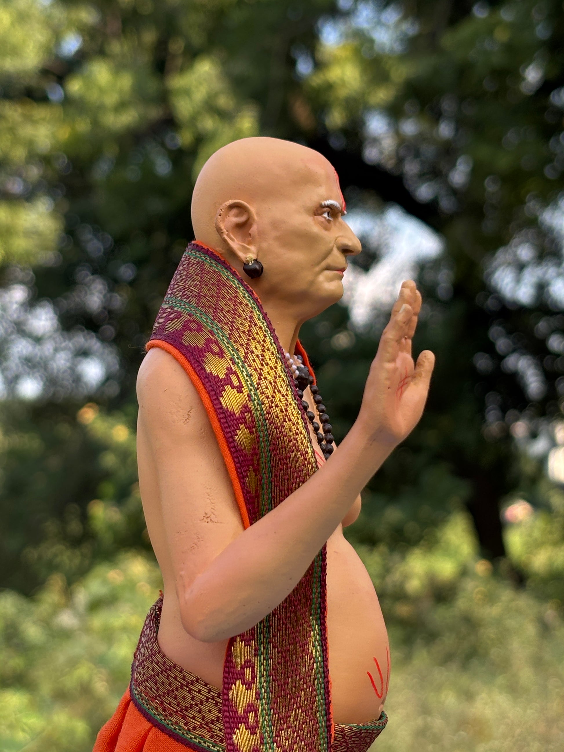 Authentic Multicolor Design: Draped in traditional orange vastra and golden-bordered shawl, symbolizing renunciation, wisdom, and divine power.
