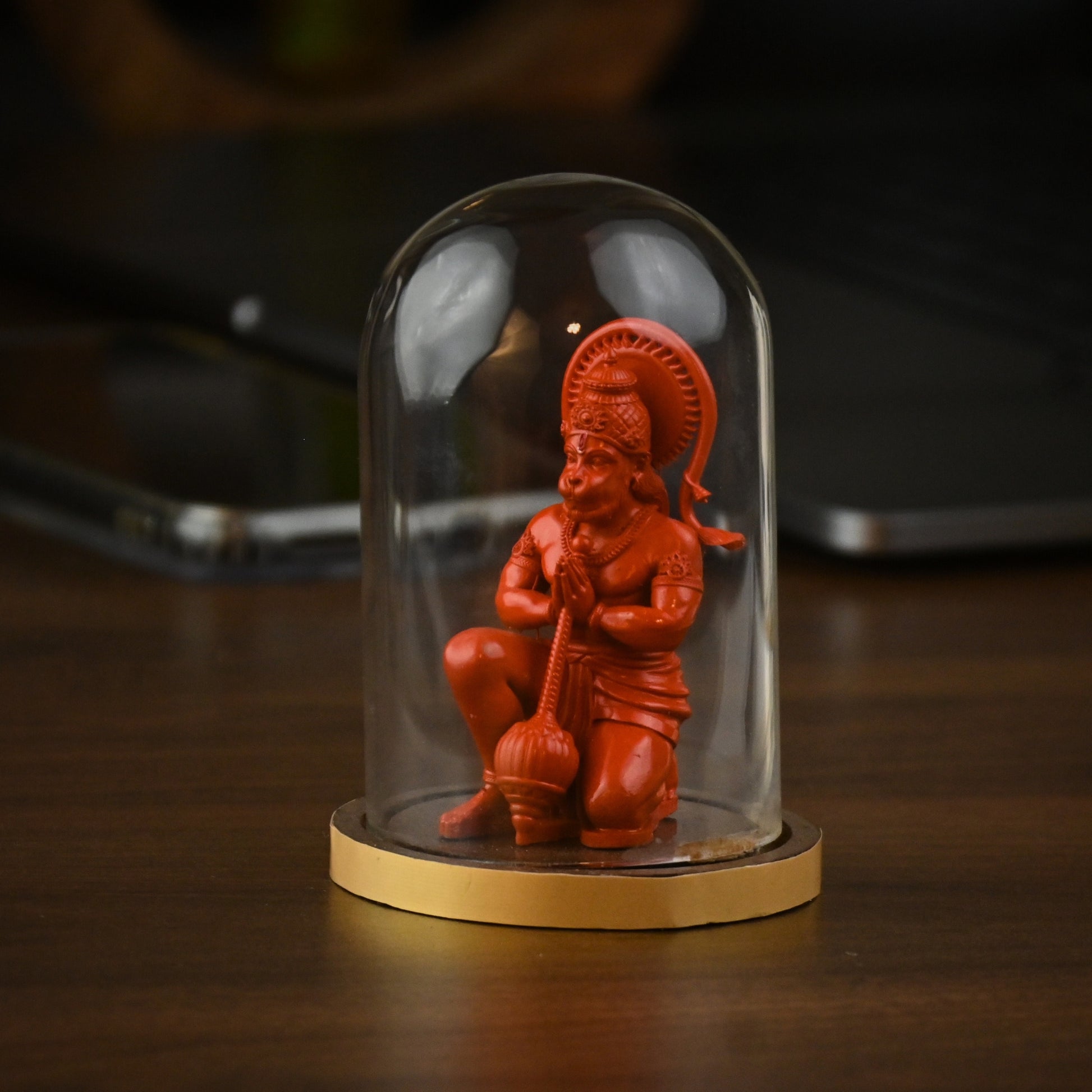 Encased in a crystal-clear dome, this sacred piece captures the moment of unstoppable strength, courage, and loyalty — the true essence of Bajrangbali.